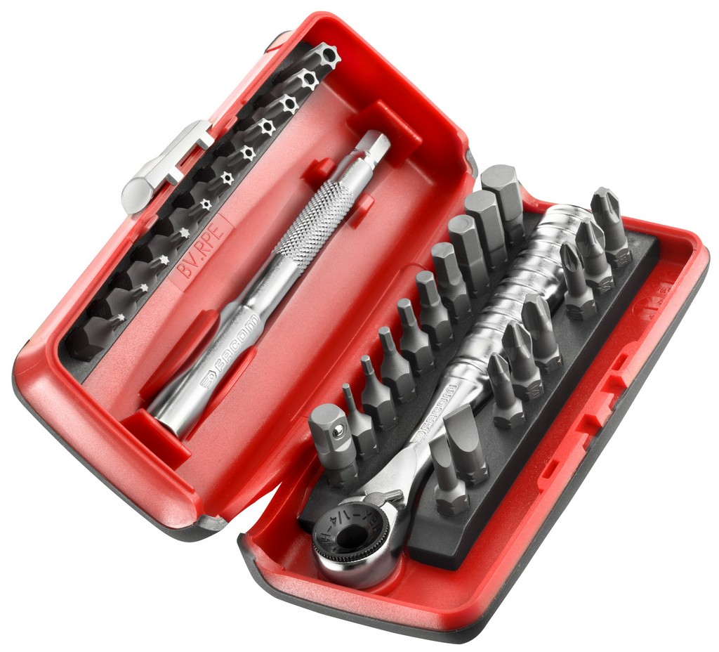 Comprenant :• Cliquet porte-embouts R.PE’.• Rallonge 100 mm.• 28 embouts : 1 TT10-15-20-25-27-30-40s T 6-7-8-9 – 3 1,5-2-2,5-3-4-5-6-7-8 mm( PH N° 1-2-3 – § PZ N° 1-2-3 – ‘ 4-5,5 mm+ adaptateur ECR • Coffret ultra-compact.