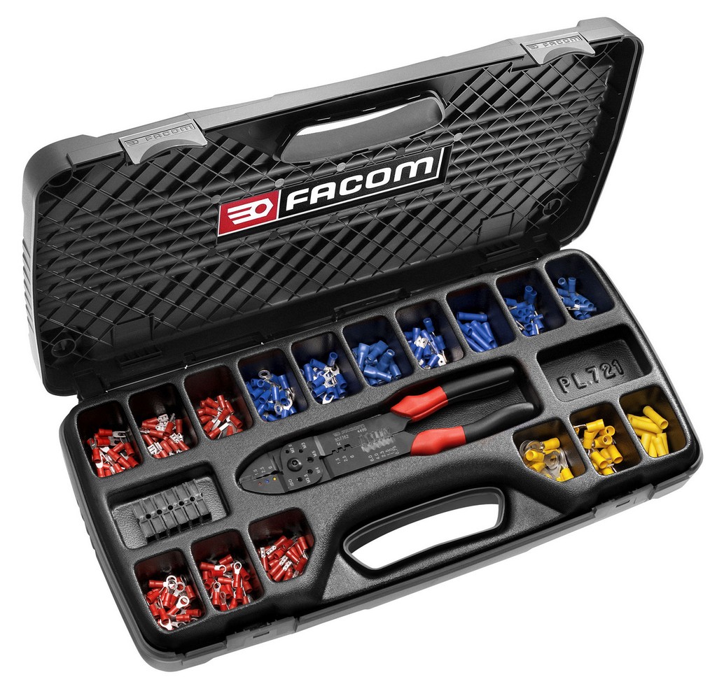 Comprenant : une pince à sertir + Un assortiment de 20 modèles de cosses pré-isolées et d’accessoires :- Oeillets.- Fourches.- Manchons + Cosses mâles et femelles.