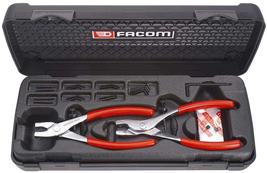 Pince pour Circlips intérieurs.- Pince pour Circlips extérieurs.- Clé mâle.- Jeu de 18 becs amovibles.