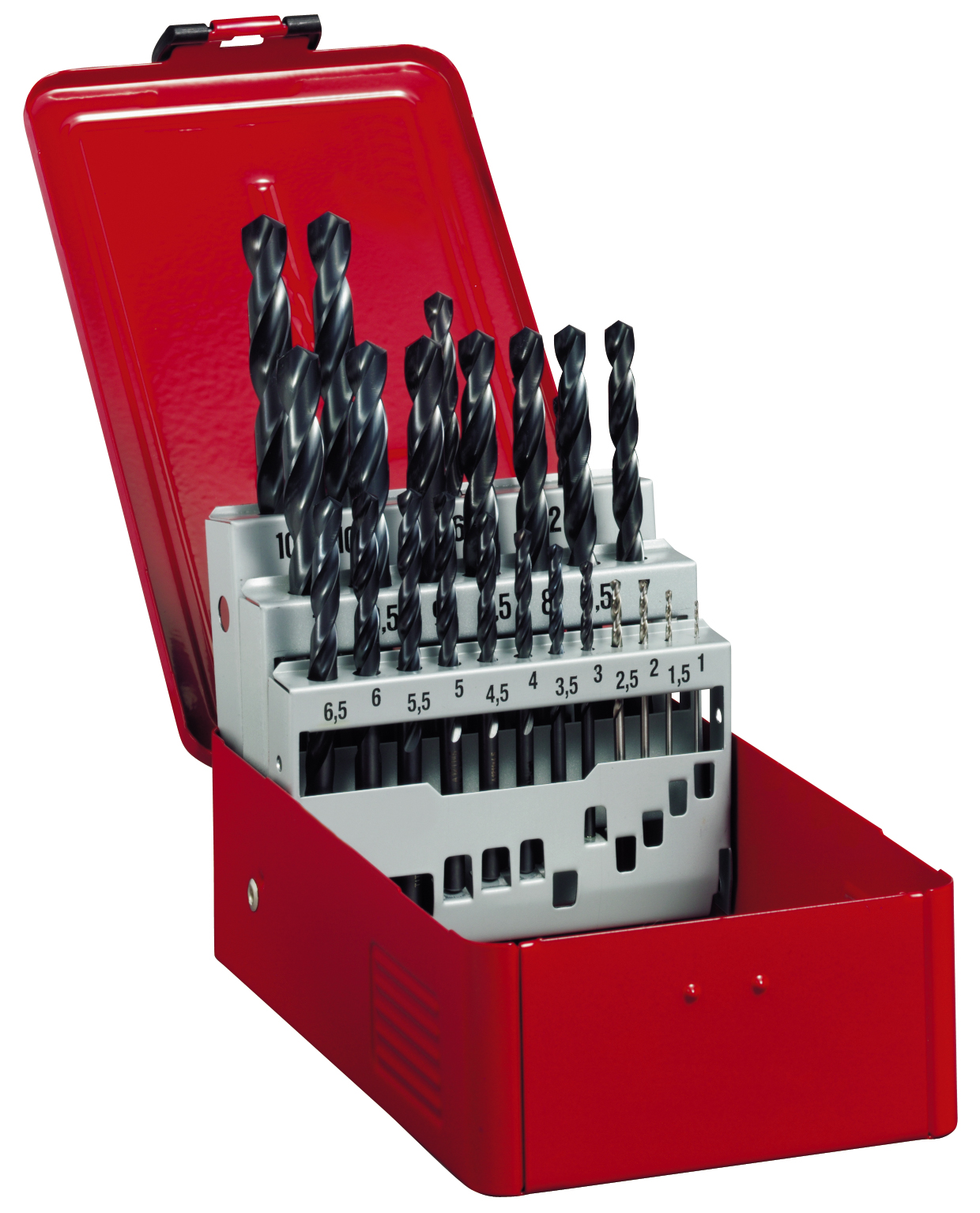 Coffret de 24 forêts hélicoïdaux HSS – traité vapeur – diamètre de 1,0 à 10,5 + diamètre 3,3/4,2/6,8/10,2mm. – par pas de 0,5mm.