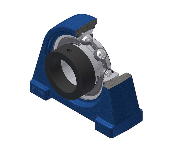 Palier auto-aligneur à semelle en fonte. Roulement insert avec serrage par bague excentrique.