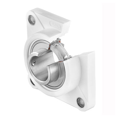 Palier auto-aligneur à applique thermoplastique avec 4 trous, insert en acier inoxydable avec lubrification solide LUBSOLID®, fixation par vis.