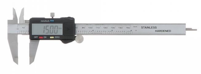 1 bec pour mesures intérieures. 1 bec pour mesures extérieures. 3 boutons : -marche Arrêt (ON/OFF) – changement d’unité (mm/inch) -remise à zéro(ZERO). Ecran 40×16 mm. Lecture et affichage au 1/100. Jauge de profondeur Vis de blocage sur le vernier. Sortie de données RS232. Avec molette Capacité : 150 mm Précision mesurée plein bec extérieur : 3/100 Hauteur bec : 40/20 mm