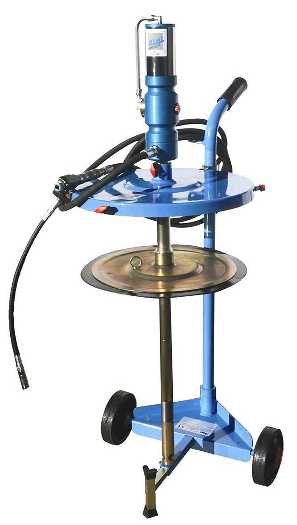 Composition : Pompe pneumatique 60/1, Couvercle et joint suiveur, Flexible 4 m et pistolet à graisse, chariot 2 roues avec un bras.