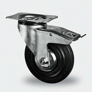 Roulette pivotante à blocage total suiveur, Chape en acier embouti, Finition zinguée, Pivot sur double chemin de billes, Axe de roue boulonné, Fixation à platine.