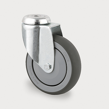 Roulette pivotante – chape zinguée – pivot sur double rangée de billes – axe boulonné – corps de roue polypropylène- bandage thermoplastique – moyeu à billes – fixation centrale – œil de 13 mm.
