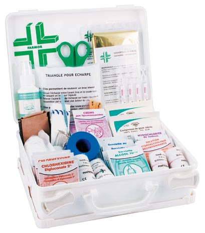 Trousse de premier secours. Boîte plastique polypropylène. Possède son support mural et facilement transportable grâce à sa poignée. Les fournitures sont présentées dans une pochette alvéolée. Dimension 250 x 185 x 83 mm.