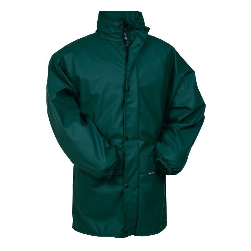 En Safethane. Fermeture à glissière centrale double curseur sous rabat fermé par pressions jusqu’en haut du col. Capuche dans le col, avec cordon de serrage. 2 poches basses étanches passepoilées avec rabat. Poignets élastiqués. Montage étanche. EN 343/3-1.